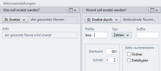 Die Nummerierung lässt sich individuell anzupassen. Zum Beispiel kann der Startwert oder die Anzahl der führenden Nullen festlegt werden. Außerdem ist es möglich, sich unterscheidende Ordner und/oder Datei-Typen extra zu nummerieren.